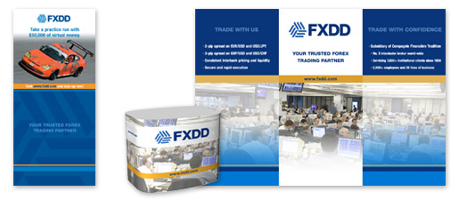 Booth, banner and table wrap designed for FXDD, a leading online retail forex firm. Sazas also developed their website, full page magazine advertising, brochures in various languages, etc.