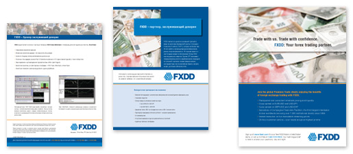Full page advertisement and one-pager brochure for FXDD, a strong, solid company in the trading arena. This brochure is part of a series design in English and Russian. Sazas also developed their website and graphics for a new booth to use at their national conventions.
